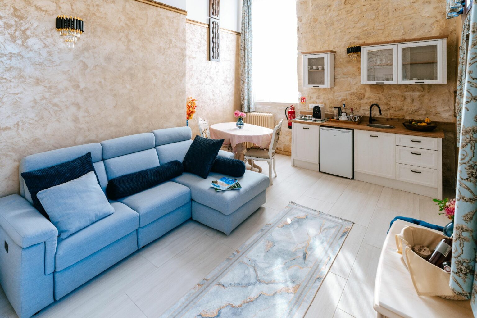 Avec ses 35 m² subtilement agencés pour deux personnes et sa hauteur sous plafond de 6 mètres, la Chambre Victoria vous accueille dans un espace lumineux (avec un salon indépendant).