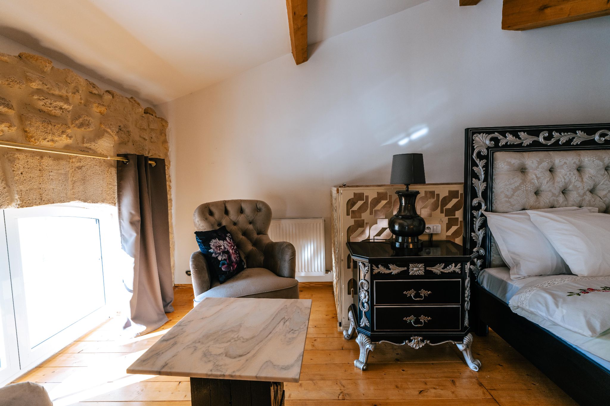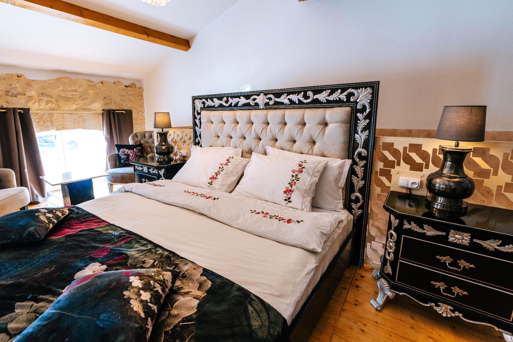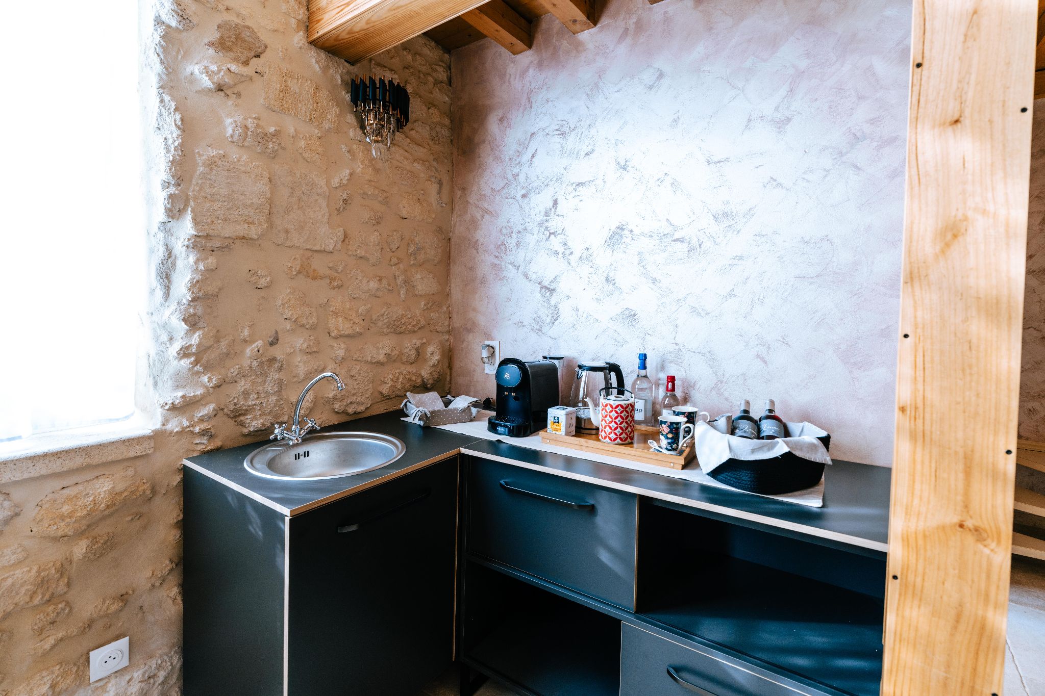 La chambre Ravenna vous accueille dans un vaste espace de luxe 76 m² aux volumes exceptionnels, avec une hauteur sous plafond de 5,5 mètres, pensé pour deux personnes (avec un salon indépendant). Elle dispose d’un lit King size (180 x 200) et d’une salle de bain élégante avec douche à l’italienne, linge fourni, sèche-cheveux et peignoirs. Une bouilloire, une théière et une machine à café sont à votre disposition, ainsi qu’une télévision à écran plat. Vous bénéficiez d’un accès à une piscine chauffée partagée de 13 x 5 mètres, et une boisson fraîche offerte vous est proposée à votre arrivée (café frappé, jus ou soda). Un panier de bienvenue garni de produits locaux vous attend dans la chambre. Le ménage est inclus, le WiFi est accessible gratuitement, et un parking sécurisé partagé est disponible. Enfin, vous pourrez profiter d’un parc arboré aménagé de tables et de chaises longues pour un moment de détente en pleine nature.